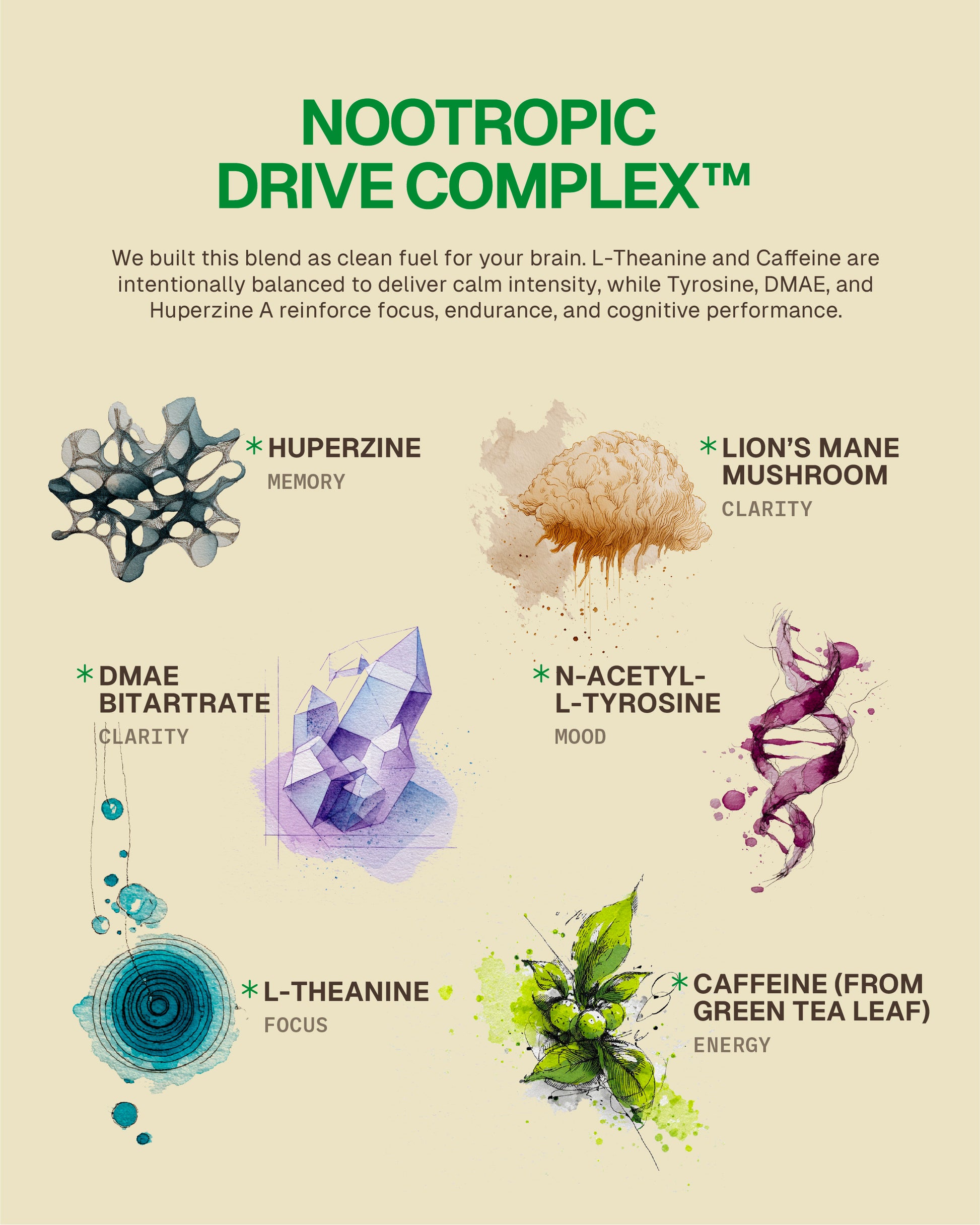 We built this blend as clean fuel for your brain. L-Theanine and Caffeine are intentionally balanced to deliver calm intensity, while Tyrosine, DMAE, and Huperzine A reinforce focus, endurance, and cognitive performance.