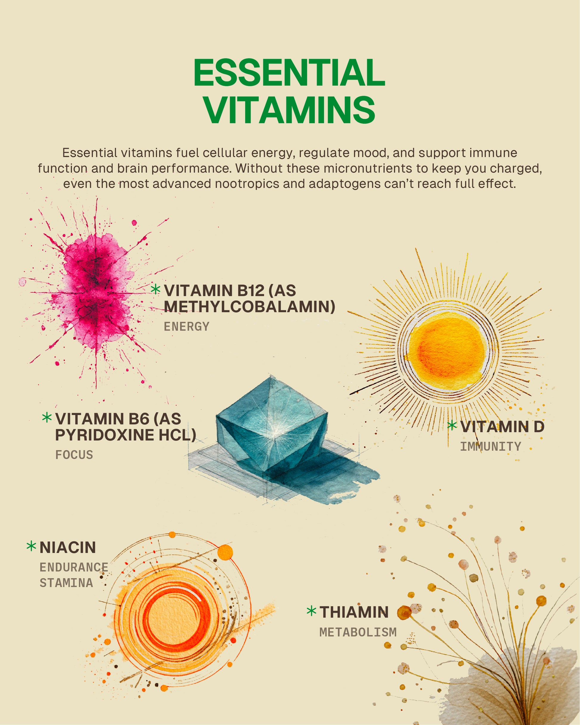 Essential vitamins fuel cellular energy, regulate mood, and support immune function and brain performance. Without these micronutrients to keep you charged, even the most advanced nootropics and adaptogens can’t reach full effect.