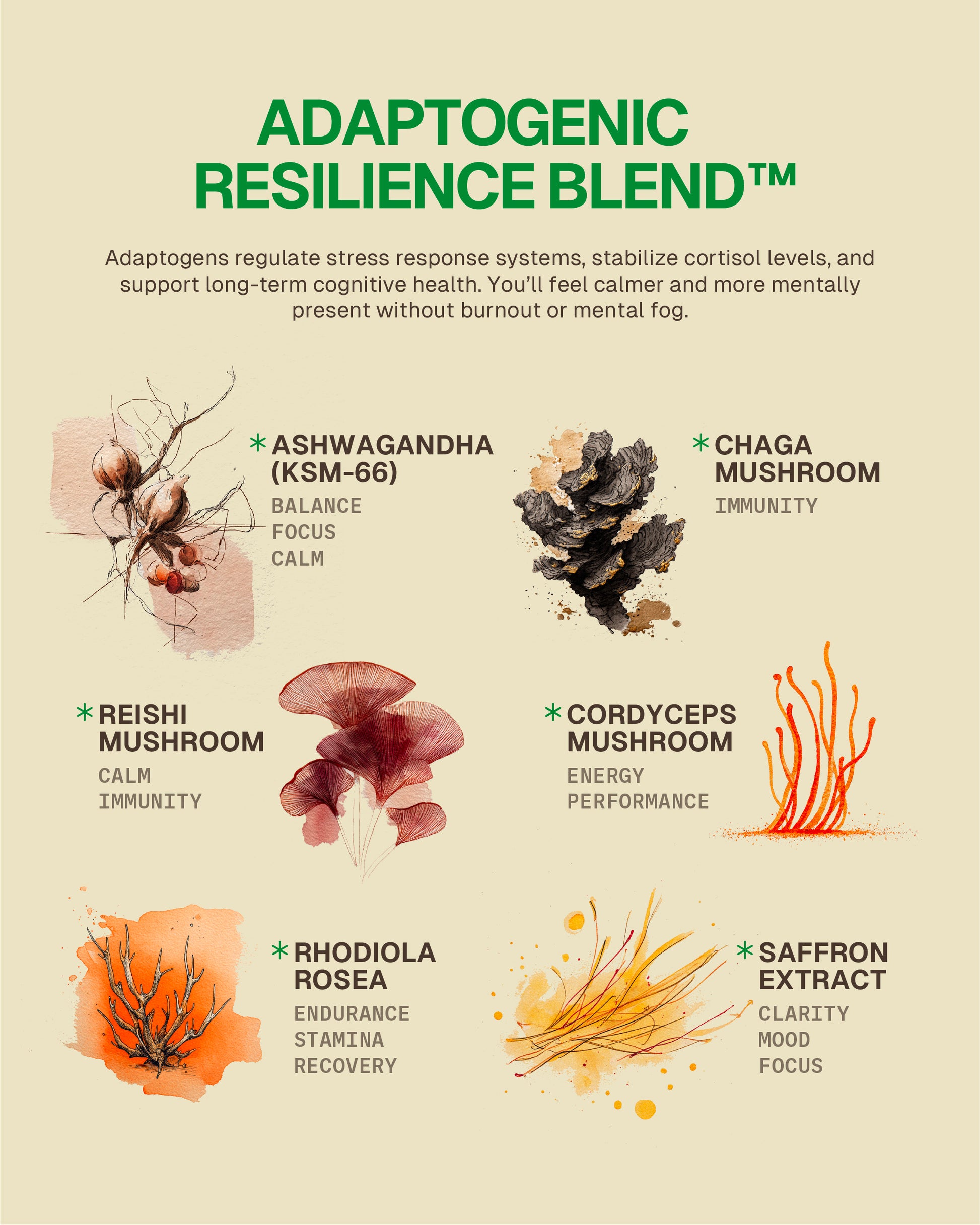 Adaptogens help the body handle stress while nootropics support mental clarity and focus. Combined, they deliver physical composure and mental sharpness at the same time.